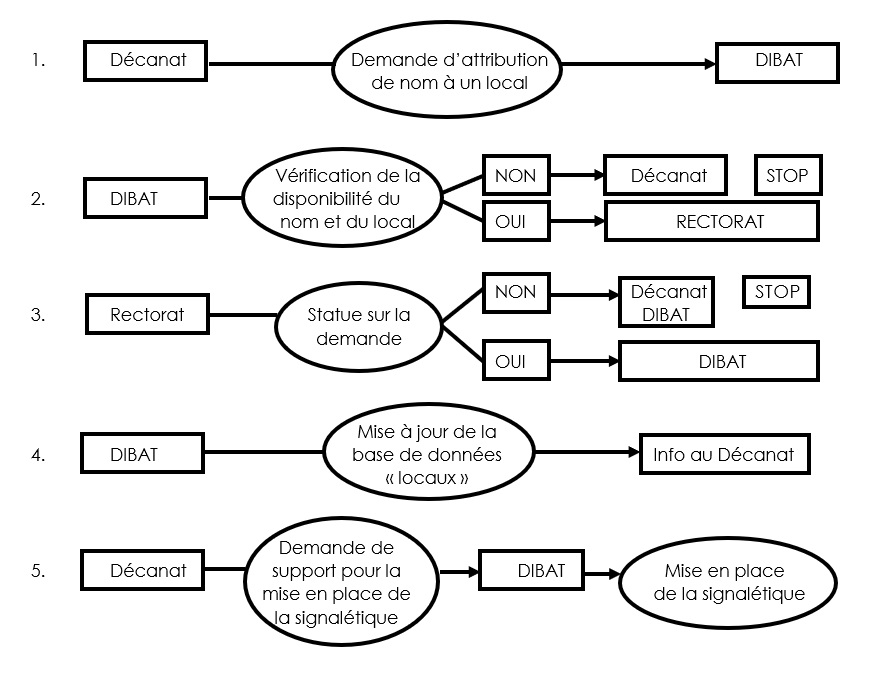 Si la décision du Rectorat est positive, la DIBAT modifie en conséquence la base de données des locaux en rajoutant à l’identifiant « officiel » alphanumérique, un identifiant nominatif. Le nom validé par le Rectorat est alors lié à l’emplacement physique du local.Si sa décision est négative, il informe le décanat demandeur et la DIBAT en indiquant les motifs du refus. La procédure s’arrête.